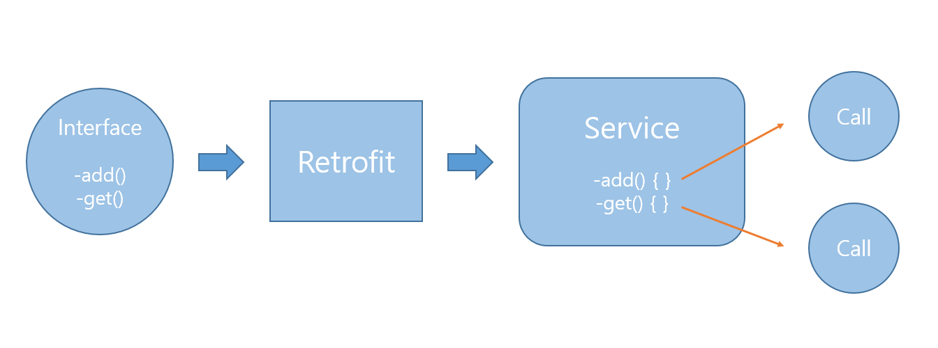 개발자가 네트워크를 연결하기 위해서는 인터페이스에 네트워킹 시 호출해야 할 함수들을 등록한다. 그렇게 추상 함수로 작성된 인터페이스를 Retrofit에 전달하면 Retrofit에서 인터페이스의 함수를 구현해 실제 네트워킹을 진행해 주는 Service 객체를 반환해준다. 이 Service 객체가 바로 Call 객체를 반환해주는 객체이다. 이렇게 Service 객체를 획득하고 실제 네트워킹이 필요한 순간에 Service의 함수를 호출하여 Call 객체를 받고 Call 객체에게 일을 시키면 된다.