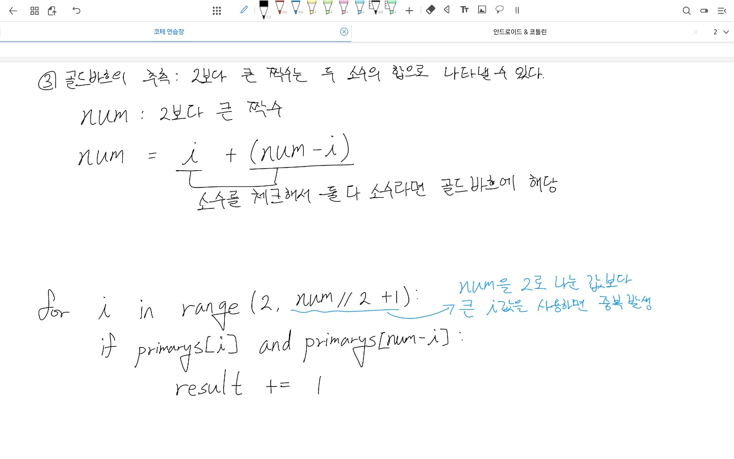 - 2보다 큰 짝수 num은 num = i + (num - i) 로 나타낼 수 있고 i랑 (num - i)가 둘 다 소수인지만 증명하면 골드바흐의 추측에 해당한다.